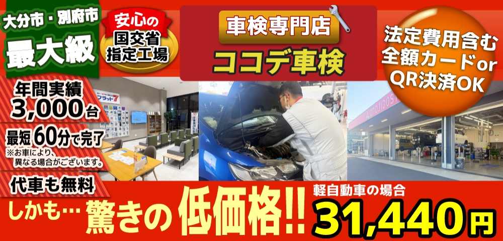 代車が必要な大分市・別府市・由布市・臼杵市・杵築市・日出町エリアのお客様のご要望にお応えして、車検時代車無料サービス始めました! ※ 代車は、短時間で車検が完了できない場合に限らせて頂いております。ご容赦ください。