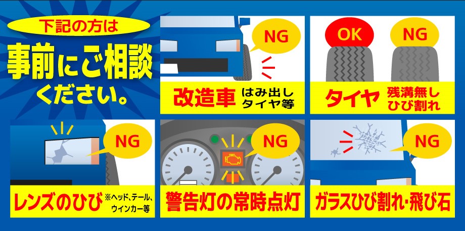 ※ 違法改造車・並行輸入車・Wタイヤの車検は当店では受け付けておりませんのでご了承ください。