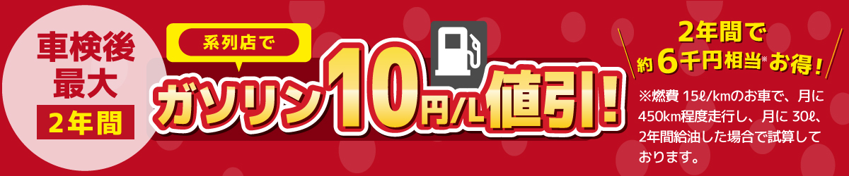 当店で車検を実施して頂いた方には、併設店にて次回車検時まで使えるガソリン10円/ℓ引き特典を贈呈致します。