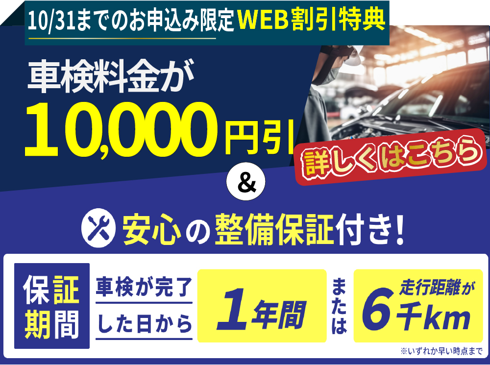 10/31までに当HPの電話番号、予約フォームよりお申込みいただいた方は10,000円引き!※実際に車検を受けて頂く日(お車の入庫日)が2026年3月末までの方が対象となります。
